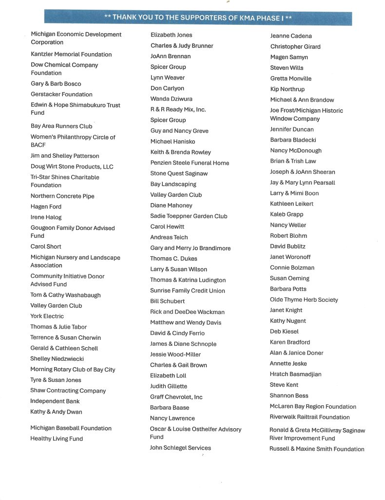 Bay City in Bloom has partnered with the City of Bay City, local organizations, and community volunteers to promote and improve Kantzler Memorial Arboretum, (KMA). Together our collaborative goal is to support and assist in overseeing the arboretum. The continued care and improvements for this beautiful space remains in part dependent upon the contributions of supporters following the vision and mission of the Bay City in Bloom and all collaborative partners. Become a supporter of Kantzler Memorial Arboretum today!